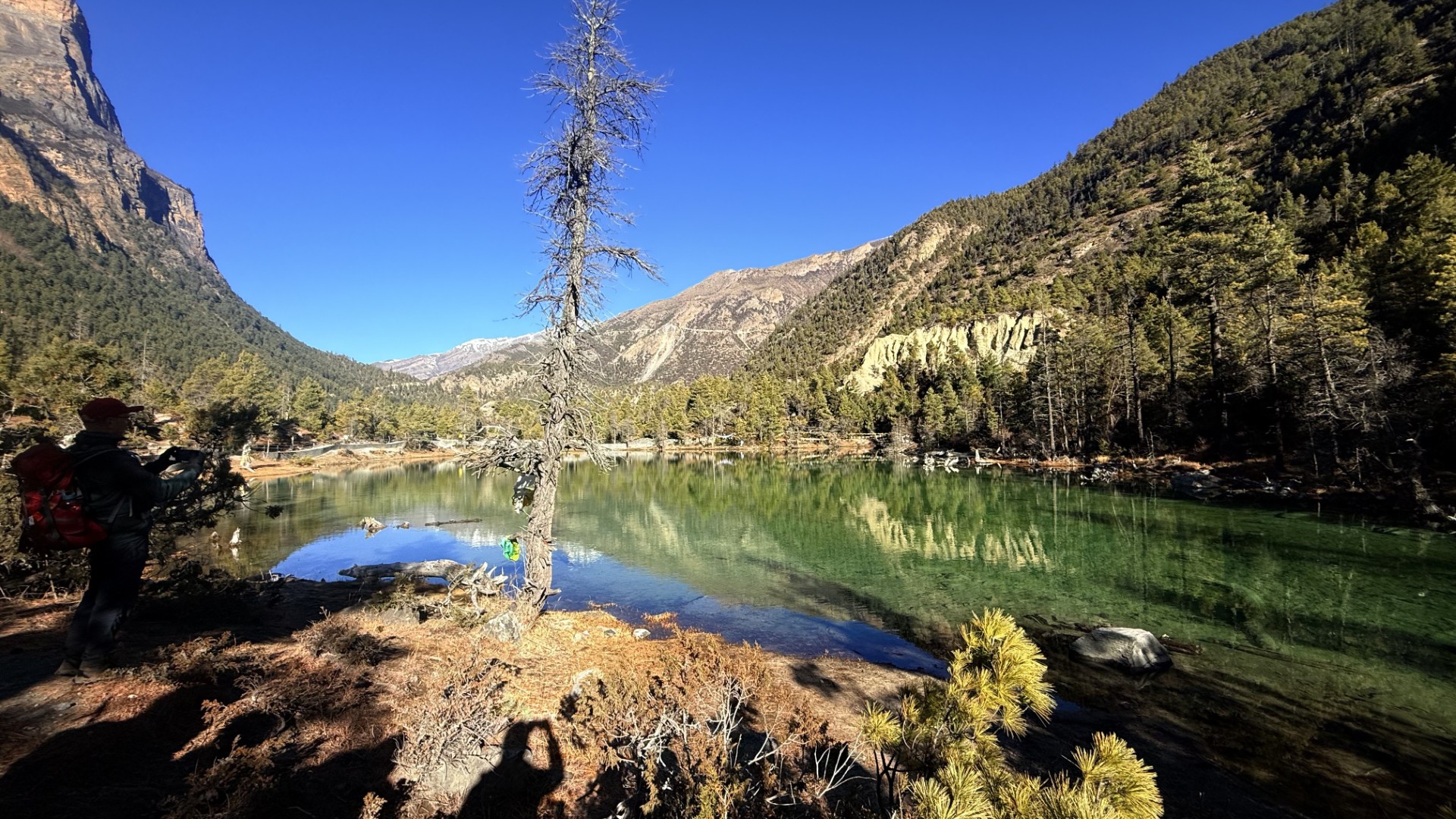 Nous marcherons sur un sentier escarpé. Il est bordé de forêts de pins de chaque côté. Le paysage est spectaculaire, car nous traversons les rochers et arrivons soudain dans une vallée de l’autre côté. La vue depuis ce point est tout simplement à couper le souffle. C’est la route vers Chame – avec vue sur les puissants sommets de l’Himalaya.